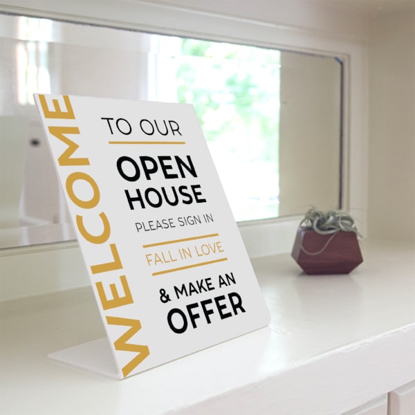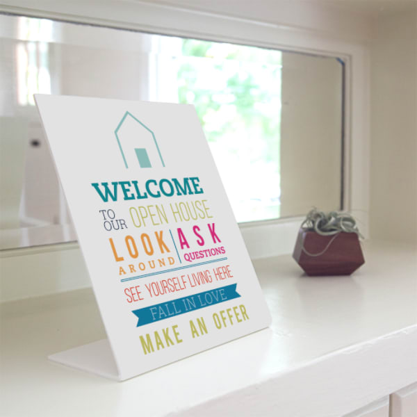 Invite interested buyers to picture themselves relaxing in their new home. Whether they're kicking off their shoes or making it a bootie party, your visitors can turn up without ever leaving a trace -- thanks to this cheery sign gently reminding visitors to cover their shoes before entering your listing. Printed on PVC Durable 8 x 5