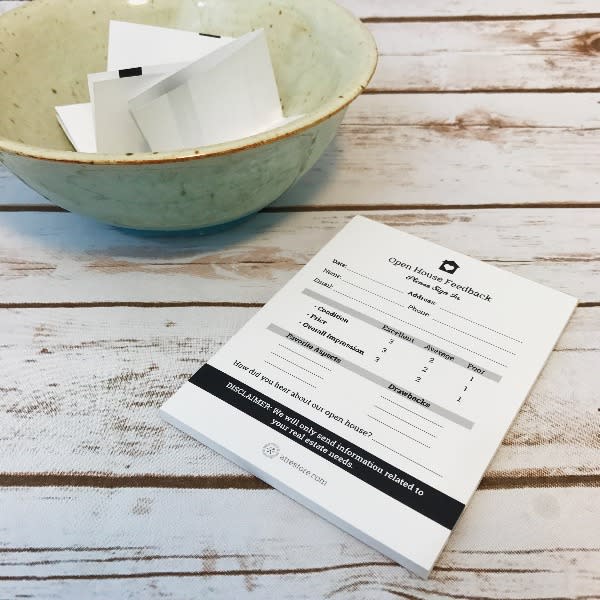 See how your guests respond to your open houses and receive feedback for yourself and sellers! 4.25" X 5.5" 50 Sheet Notepad 70LB Premium Uncoated Text with Chipboard Backer perforated pages easy for tear! small and compact