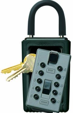 Push Button Lock Boxes with programmable entry code. New. (Contractor's Box) KeySafe Original (Portable) Push-button hangs easily on doorknob, fence, railing or pipe. Just open the lid, lift the shackle and hang. No tools necessary. Features • Key vault with removable lid. • Combination pad with ten pushbuttons. • Simple-to-change combination. • Over 1,000 possible combinations available. • Option to attach keys to the lid. • Portable vault with protective rubber DoorGuard™